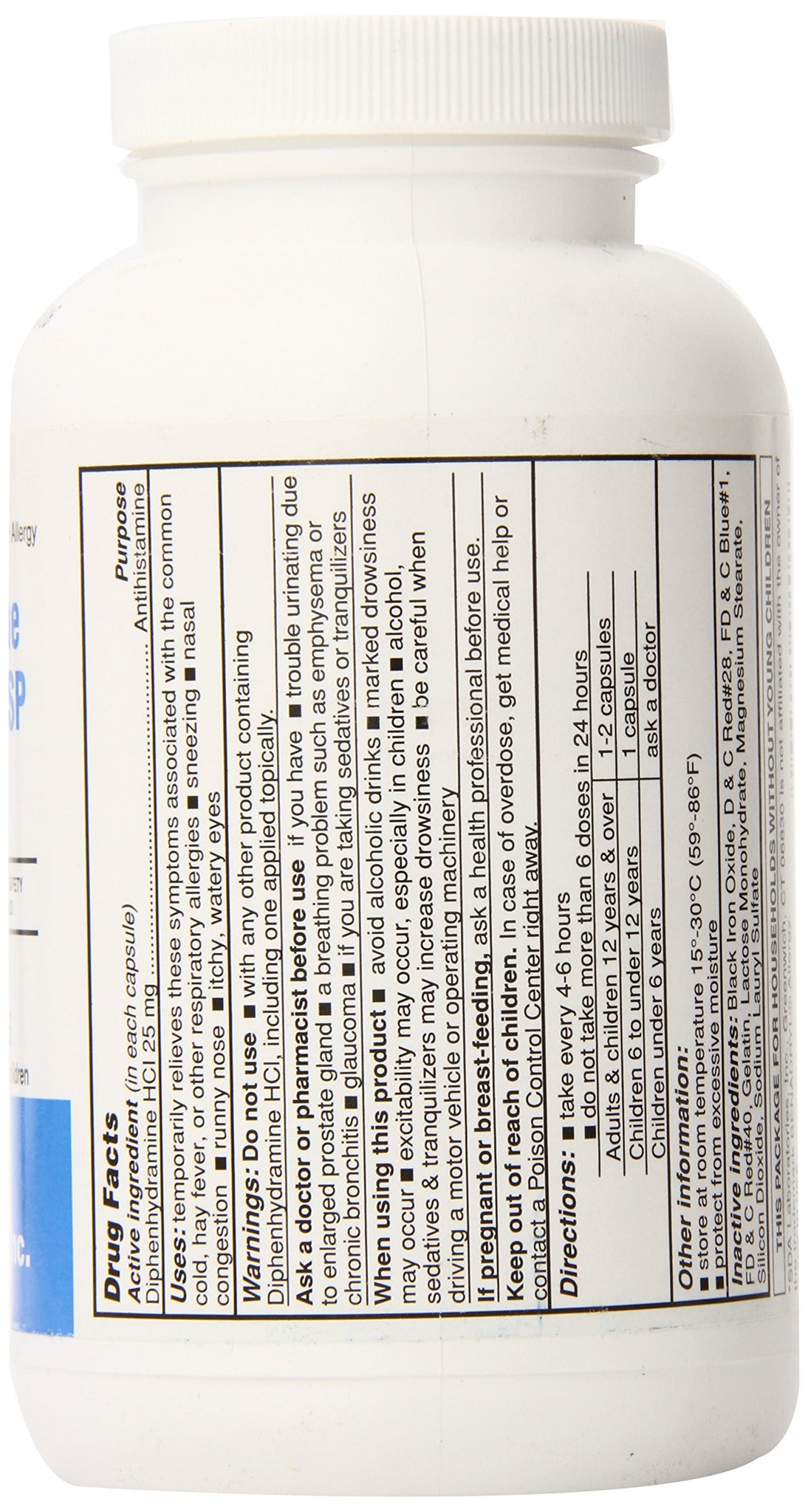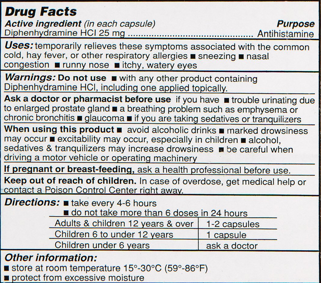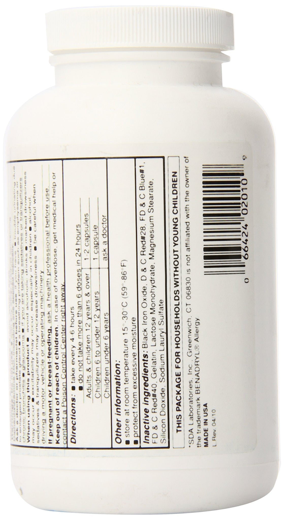 SDA Laboratories' Diphenhydramine capsules provide relief from red, irritated, itchy, watery eyes; sneezing; and runny nose caused by hay fever, allergies, or the common cold. Compare to the active ingredient in Benadryl Allergy.