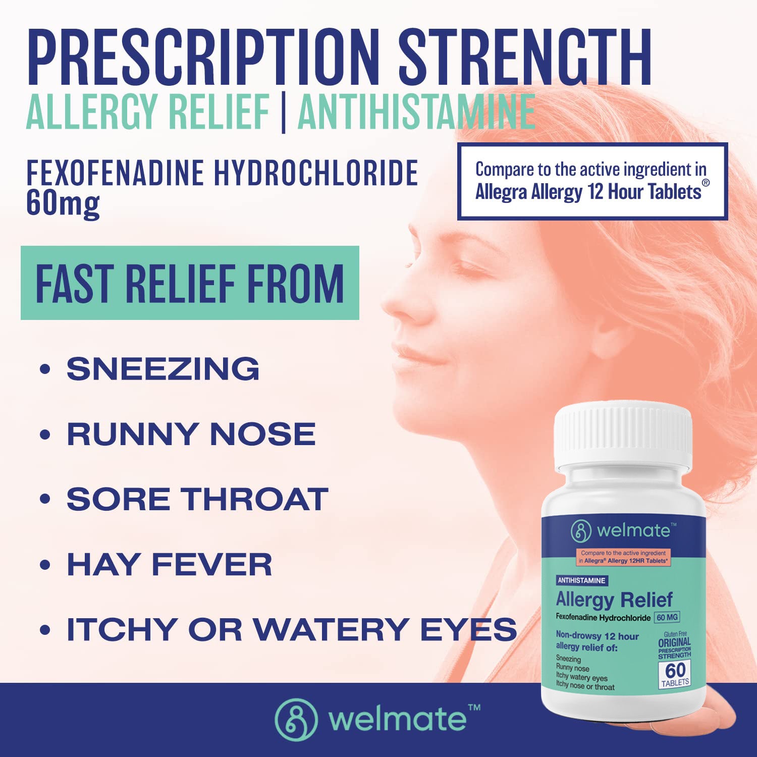 Formulated with active ingredient fexofenadine, Welmate Allergy Relief's prescription-strength antihistamine contains 60mg of Fexofenadine HCl that provides 12-hour support for watery eyes, sneezing, runny nose, itchy throat and other symptoms of indoor and outdoor allergies. Compare to the active ingredient in Allegra Allergy 12 HR.