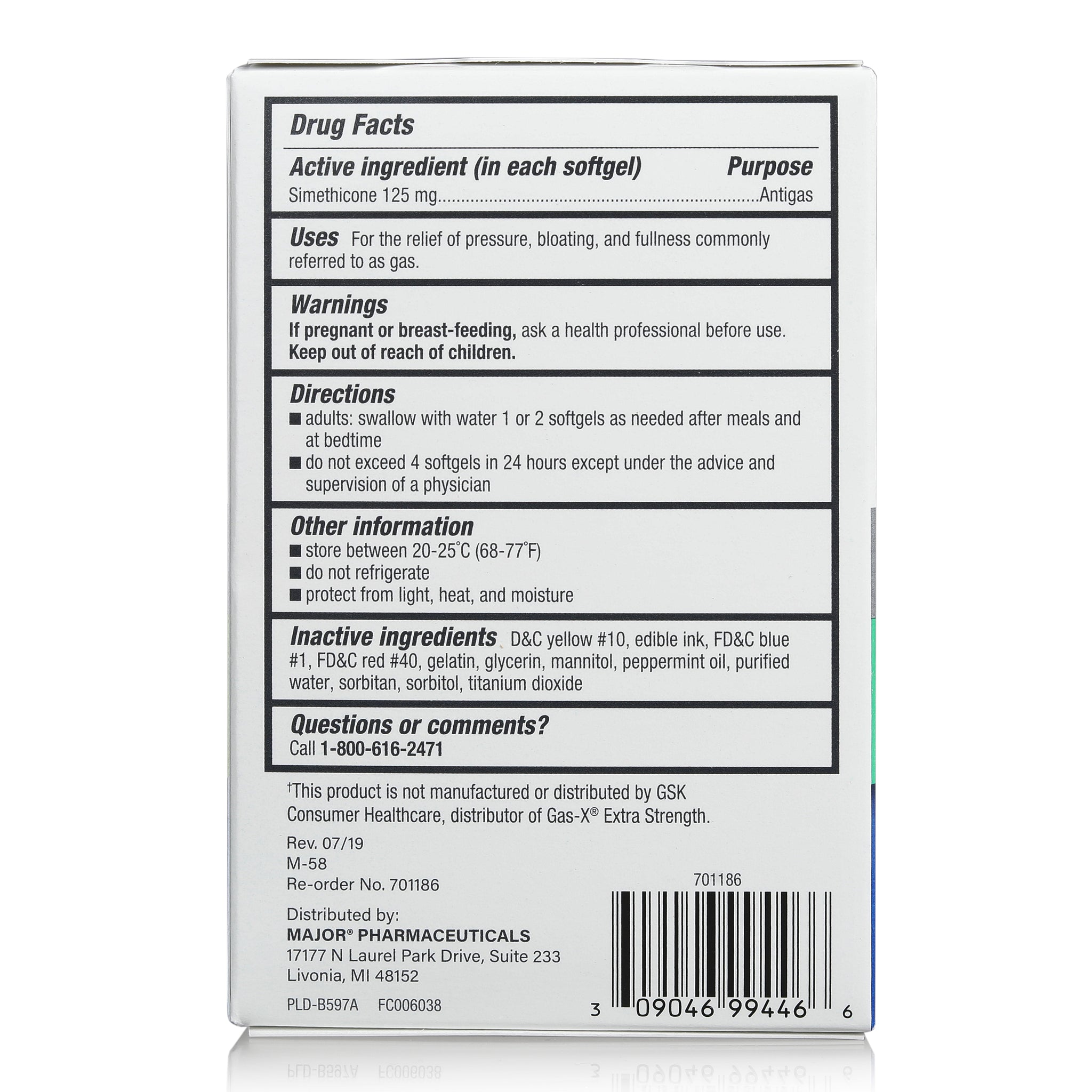 Quickly treat symptoms of gas such as pressure, bloating, and cramps with Major's Simethicone Softgels. Simethicone is recommended by doctors as the #1 active ingredient for gas relief. Compare to the active ingredient in Gas-X Softgel.