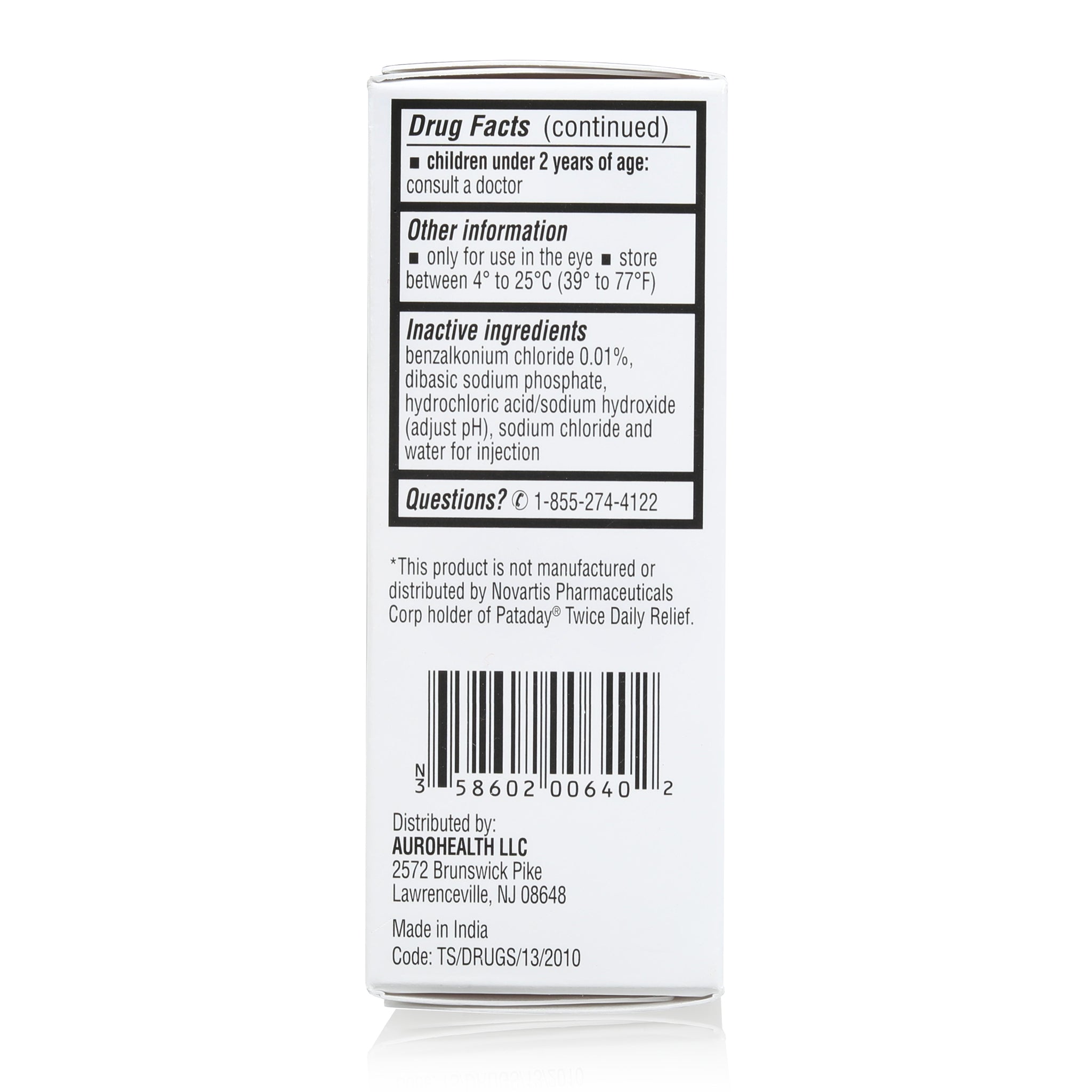 Use Aurohealth's Olopatadine Hydrochloride Ophthalmic Solution and say goodbye to itchiness caused by allergies! This eye allergy solution works to relieve itchiness caused by various types of allergens such as pet dander, pollen, grass, and ragweed. Compare to the active ingredient in Pataday Twice Daily Relief.