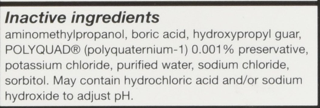 Aminomethylpropanol, boric acid, hydroxypropyl guar, Polyquad (polyquaternium-1) 0.001% preservative, potassium chloride, purified water sodium chloride, sorbitol. May contain hydrochloric acid and/or sodium hydroxide to adjust pH.
