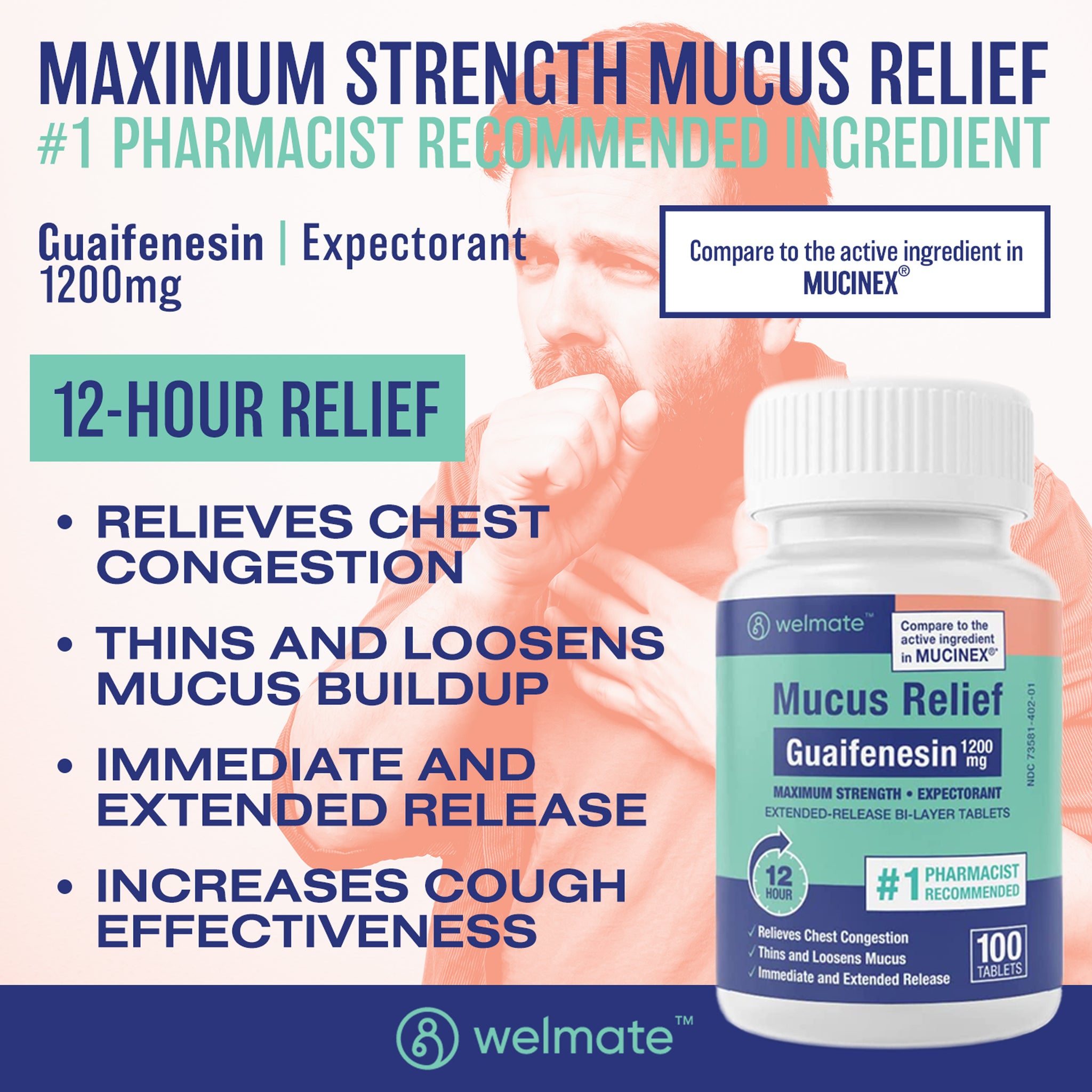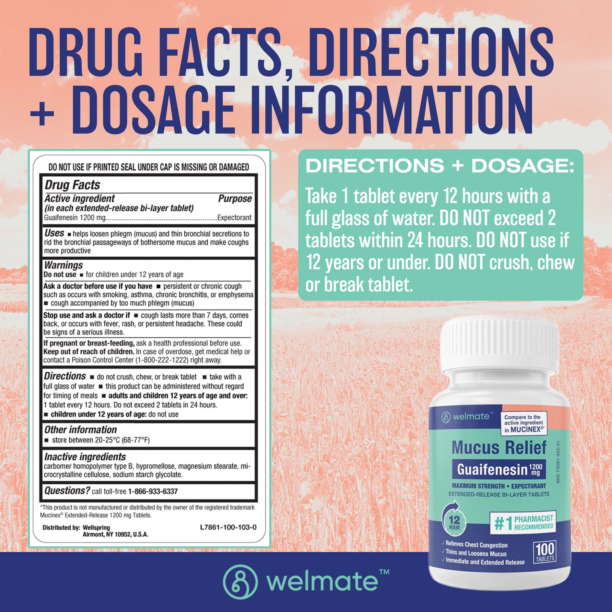 Looking for help loosening mucus and clearing out your chest for more productive coughing? With Welmate's Mucus Relief, you can have up to 12 hour relief from symptoms associated with mucus build up and coughing. Use one tablet every 12 hours for best results. Generic of Mucinex.