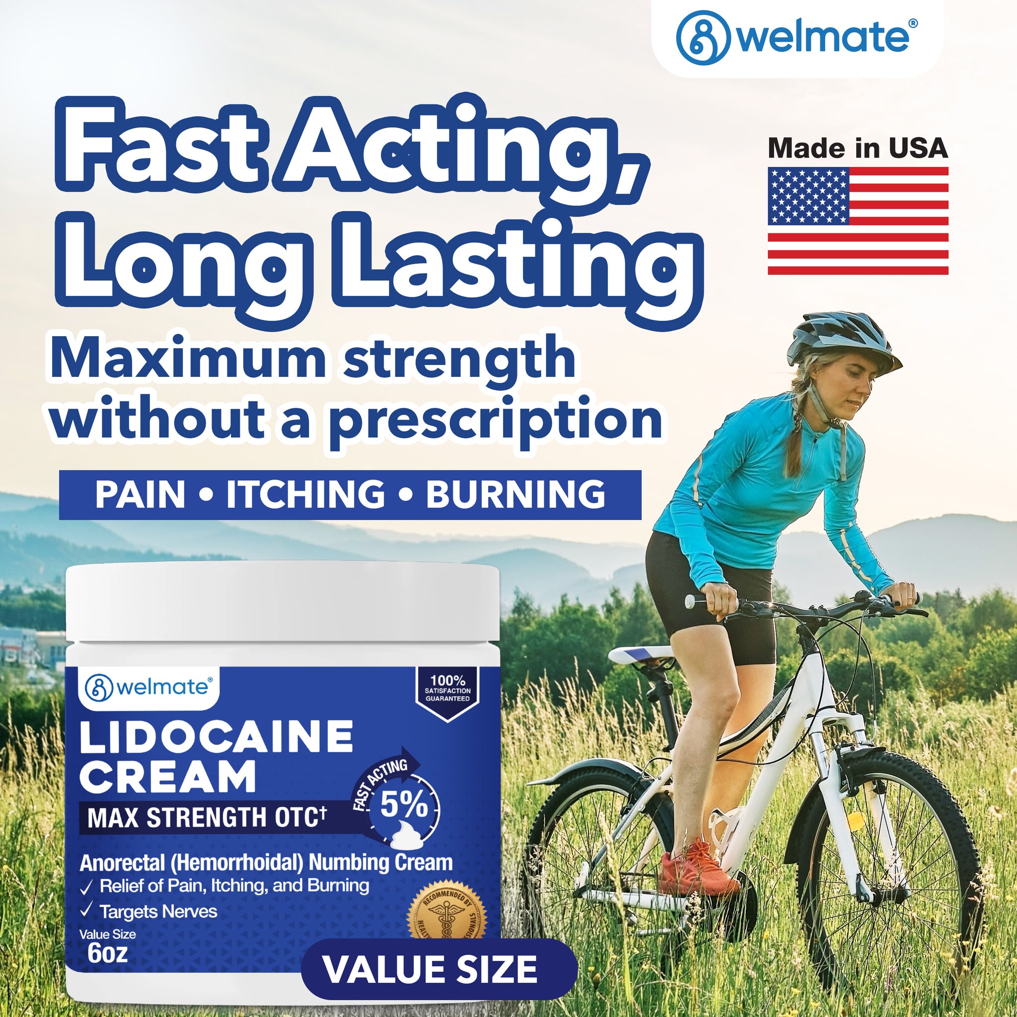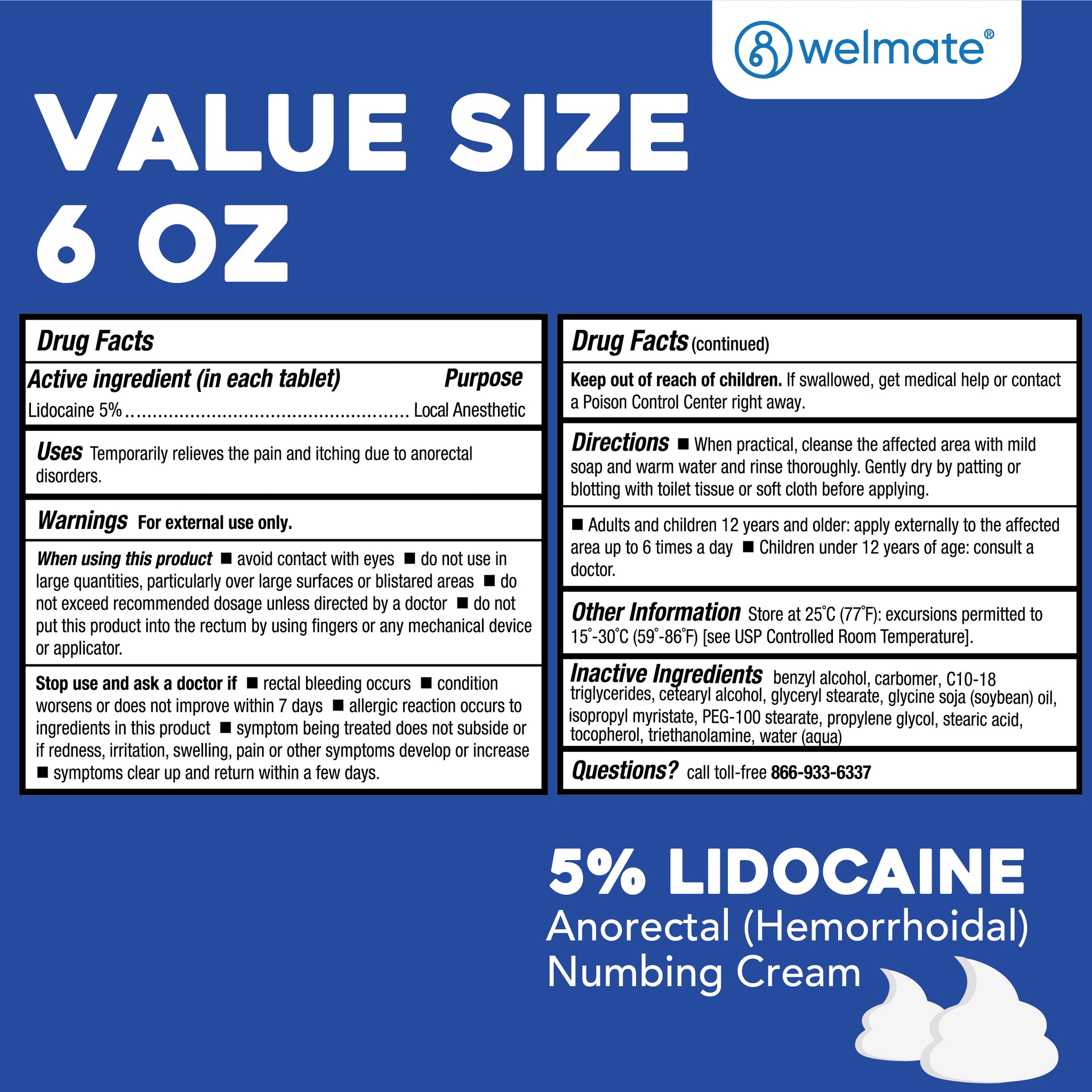 Experience maximum strength relief with WELMATE 5% Lidocaine Cream. Our advanced formula delivers fast-acting numbing relief for pain, itching, and burning caused by various conditions, including hemorrhoids, muscle pain, and arthritis. Containing 5% lidocaine, the highest strength available without a prescription, this cream targets and desensitizes aggravated nerves for powerful pain relief. Enhanced with Vitamin E and glycerin, the non-greasy, fragrance-free formula promotes skin healing and provides a soothing, protective layer. Packaged in a convenient 6 oz tube, WELMATE Lidocaine Cream is like a heating pad and ice pack for on-the-go relief, whether at home, work, or the gym. Trust WELMATE for effective, long-lasting comfort whenever you need it. Apply up to 3 times daily for continuous relief.