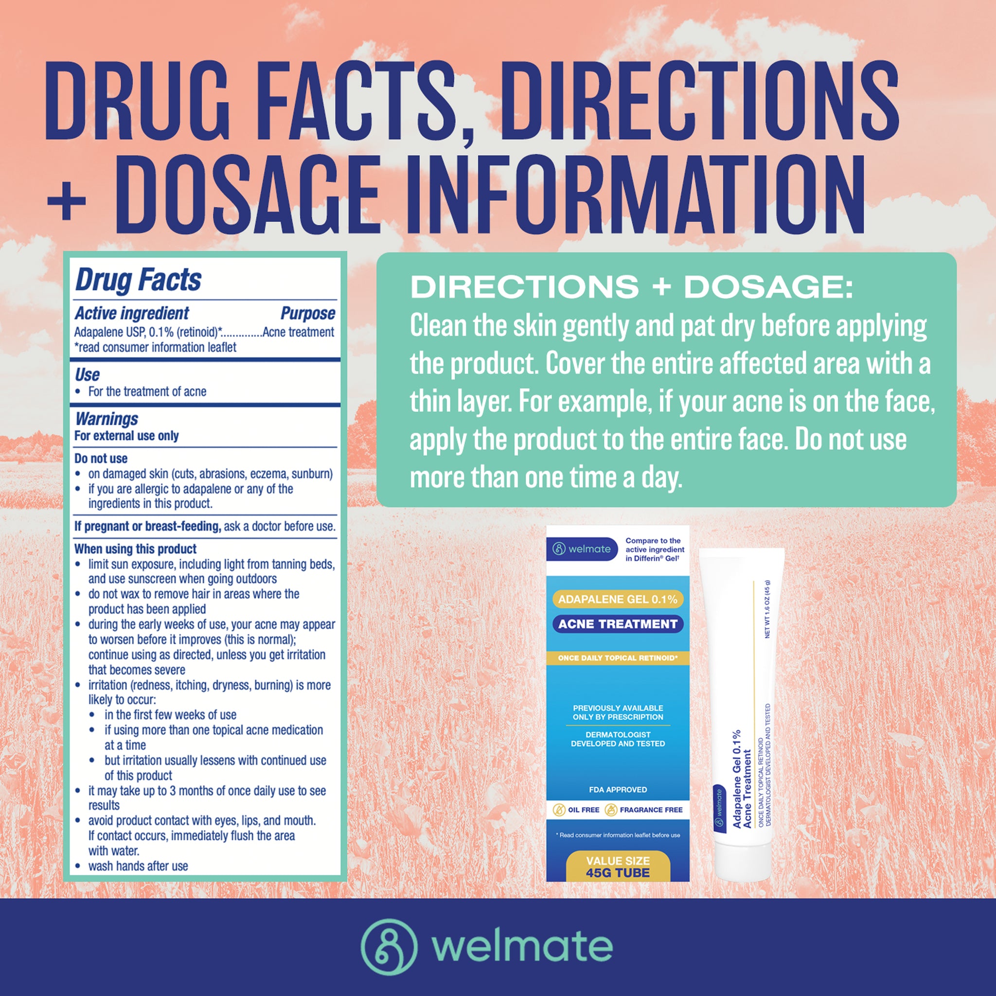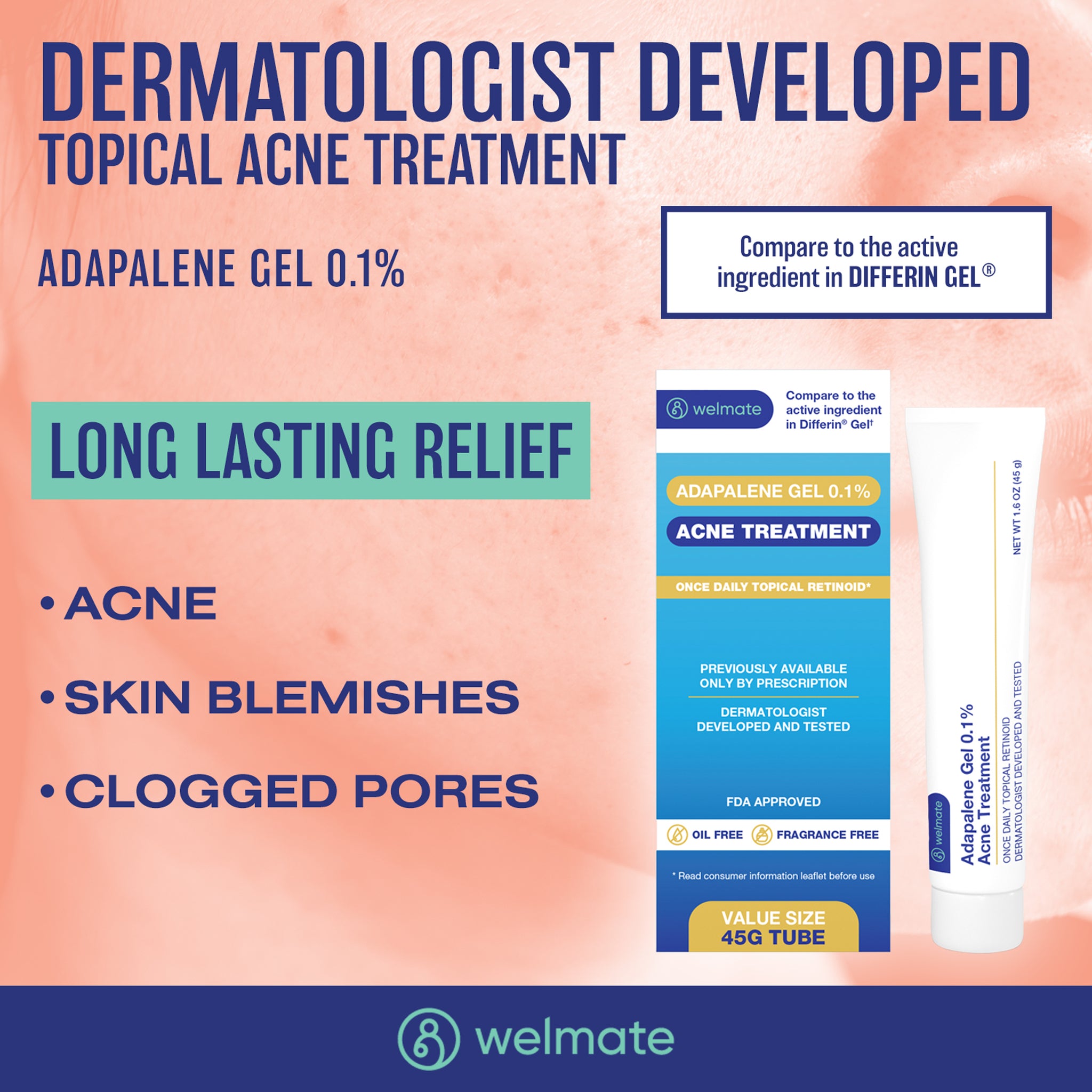 Looking for acne treatment? With Welmate's Adapalene Gel you have a once a day topical retinoid that helps treat acne. Compare to active ingredient in Differin Gel