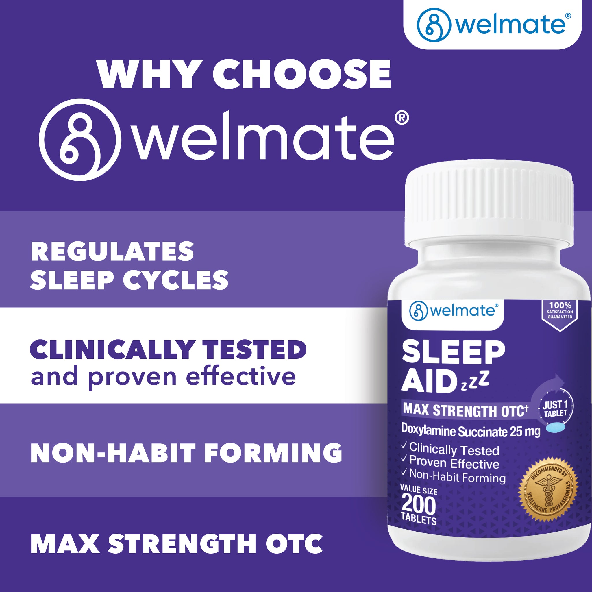 Compare to Unisom SleepTabs active ingredient. Welmate Sleep Aid Tablets are a nighttime sleep aid to help to reduce difficulty  in falling asleep. Clinically tested and proven effective, Welmate Sleep Aid Tablets contain the active ingredient doxylamine  succinate 25 mg in each one tablet dose. This nighttime sleep aid  contains no pain reliever.