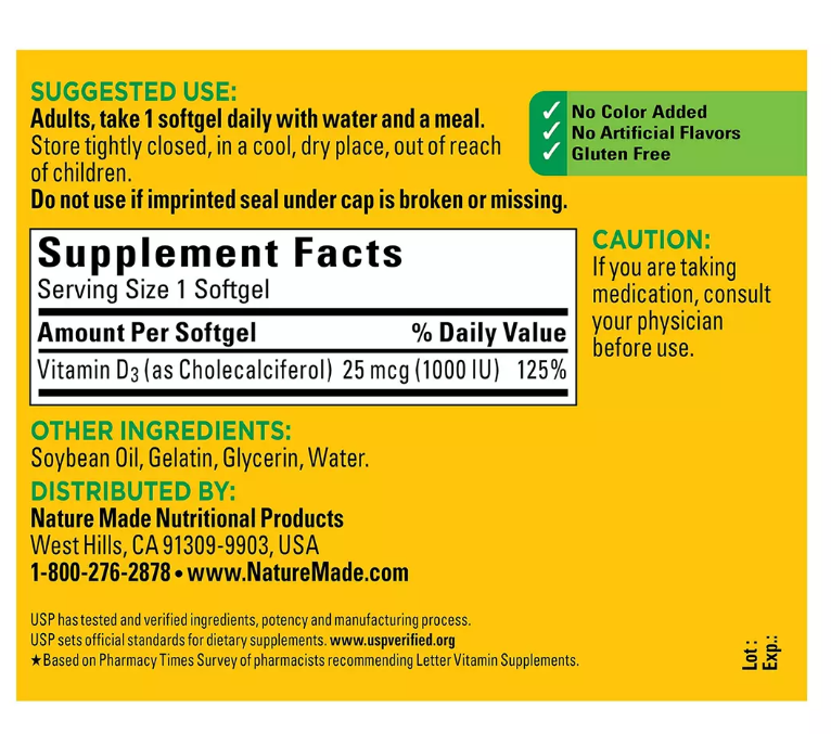 Looking for healthy Vitamin D levels ? With Nature Made Vitamin D3 Softgels, you can have bone, teeth, muscle health and immune support that are all associated with healthy Vitamin D levels. Suggested use is 1 softgel taken daily with water and food. Does not contain colors, artificial flavors or gluten.