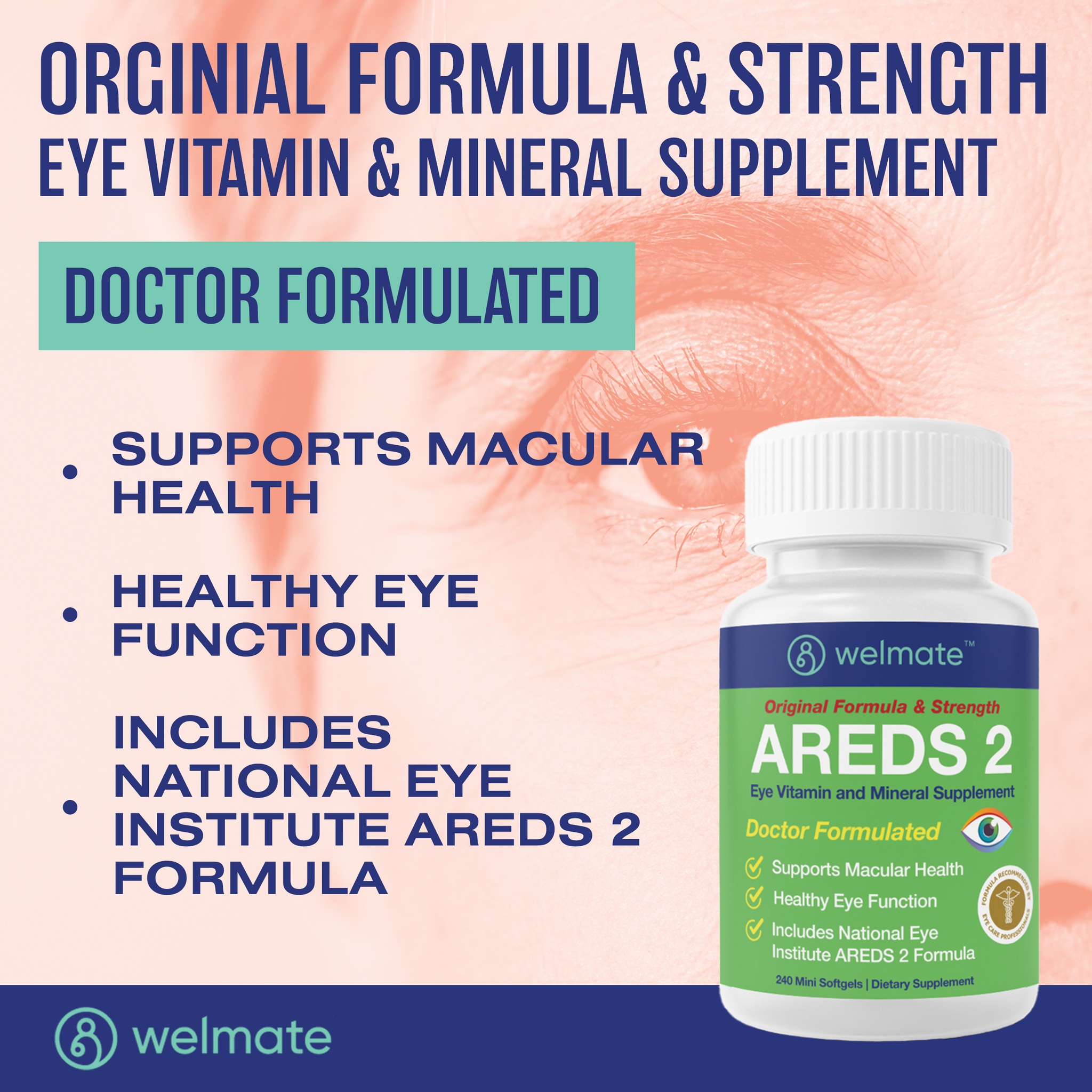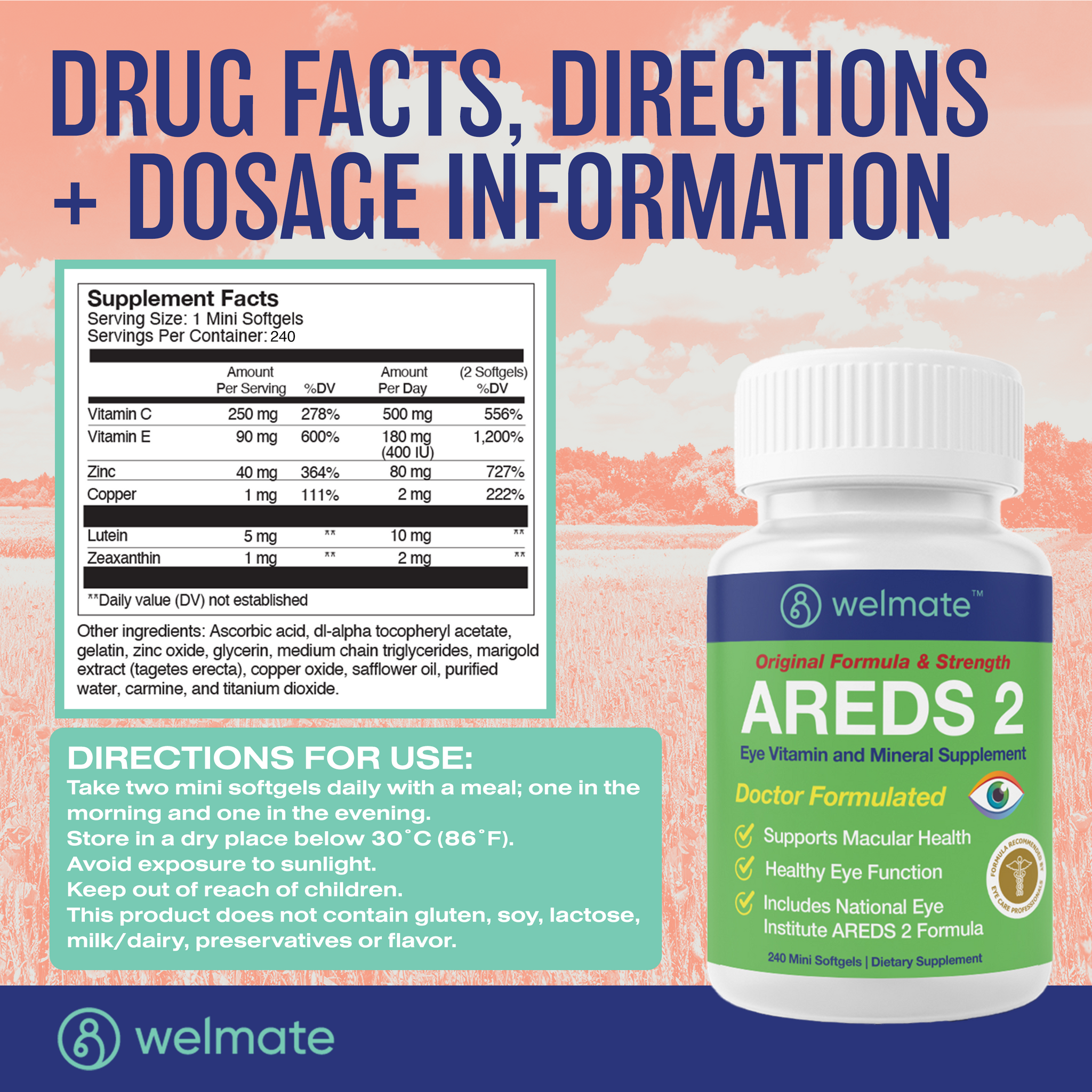 Looking to maintain eye and vision function? With Welmate's AREDS 2 softgels, you can support your macular health and promote healthy eye function with a formula that is recommended by eye care professionals. Take two mini softgels daily with a meal, one in morning and one in evening. Manufactured in the USA. Contains no gluten, soy, lactose, milk/dairy, preservative or flavor.