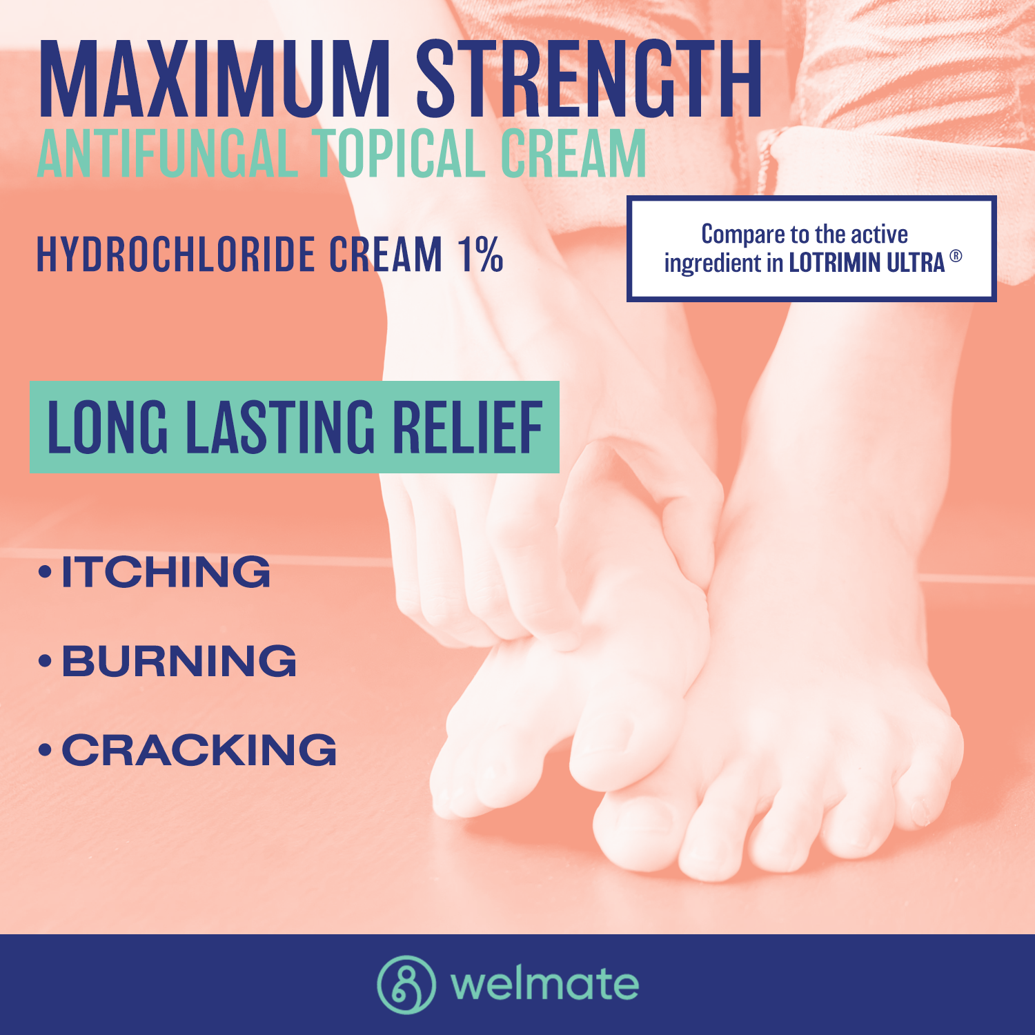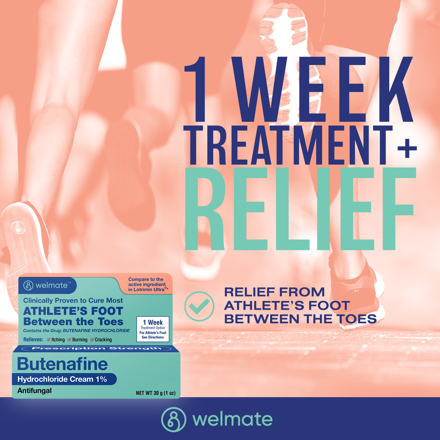 Looking to get relief from athlete's foot? With Welmate's Butenafine Hydrochloride Cream 1% Antifungal, in just one week your athlete's foot between the toes can be cured. Use twice a day for a week or once a day for 4 weeks or as directed by your doctor. Compare to active ingredient in Lotrimin Ultra.