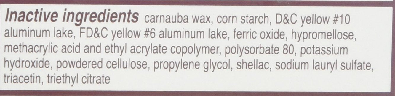 Carnauba wax, corn starch, D&C yellow #10, aluminum lake, FD&C yellow #6 aluminum lake, ferric oxide, hypromellose, methacrylic acid and ehtyl acrylate copolymer, polysorbate 80, potassium hyrdoxide, powdered cellulose, propylene glycol, shellac, sodium lauryl sulfate, triacetin, triethyl citrate