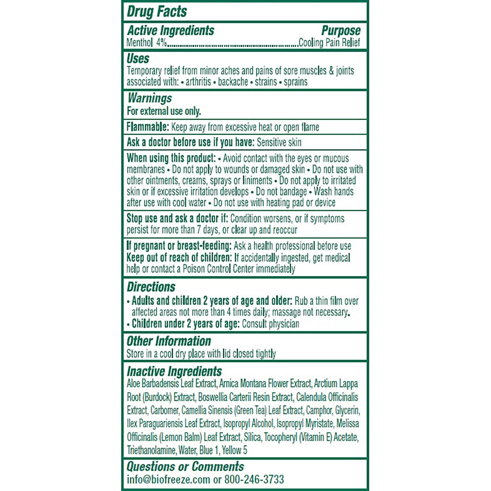 Aloe Barbadensis Leaf Extract, Arctium Lappa Root (Burdock) Extract, Arnica Montana Flower Extract, Blue 1, Boswellia Carterii Resin Extract, Calendula Officinalis Extract, Camellia Sinensis Leaf Extract, Camphor, Carbomer, Glycerin, Ilex Paraguariensis Leaf Extract, Isopropyl Alcohol, Isopropyl Myristate, Melissa Officinalis (Lemon Balm) Leaf Extract, Silica, Tocopheryl Acetate, Triethanolamine, Water, Yellow 5