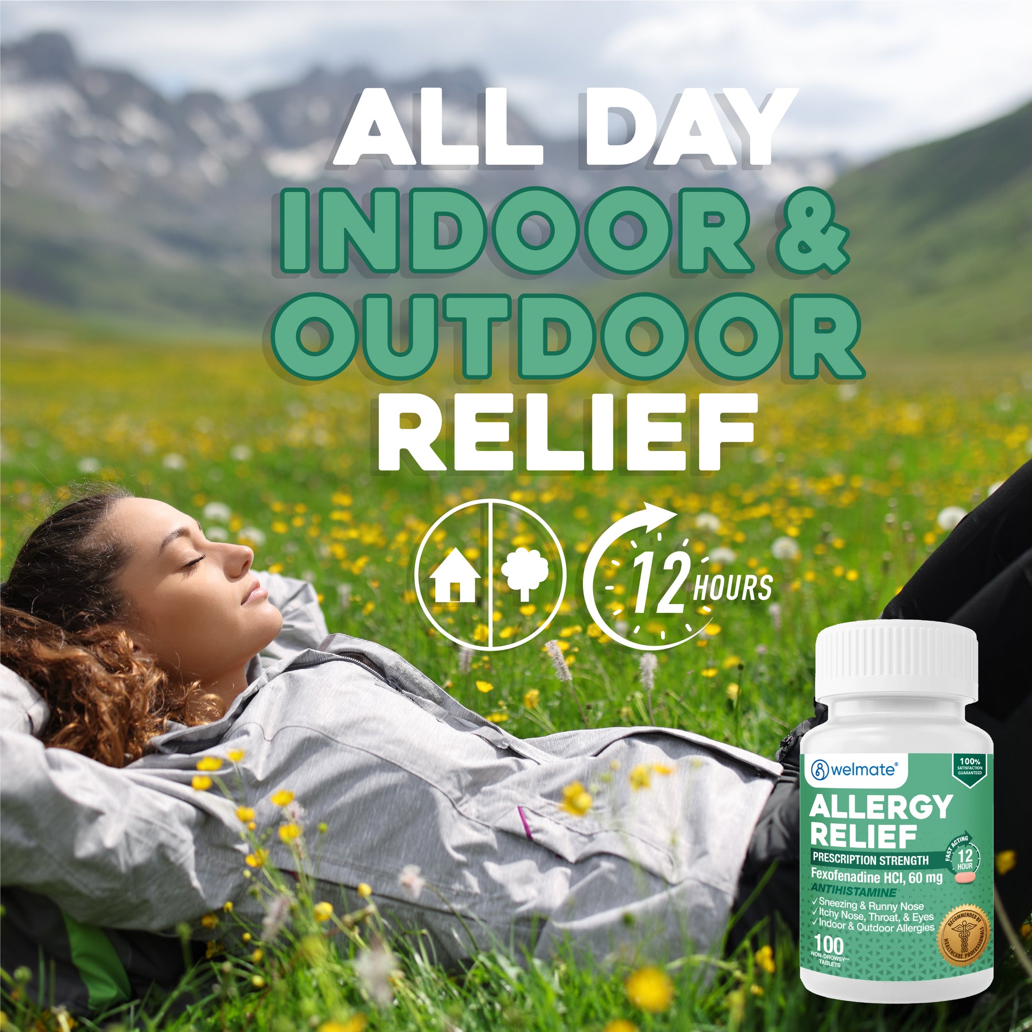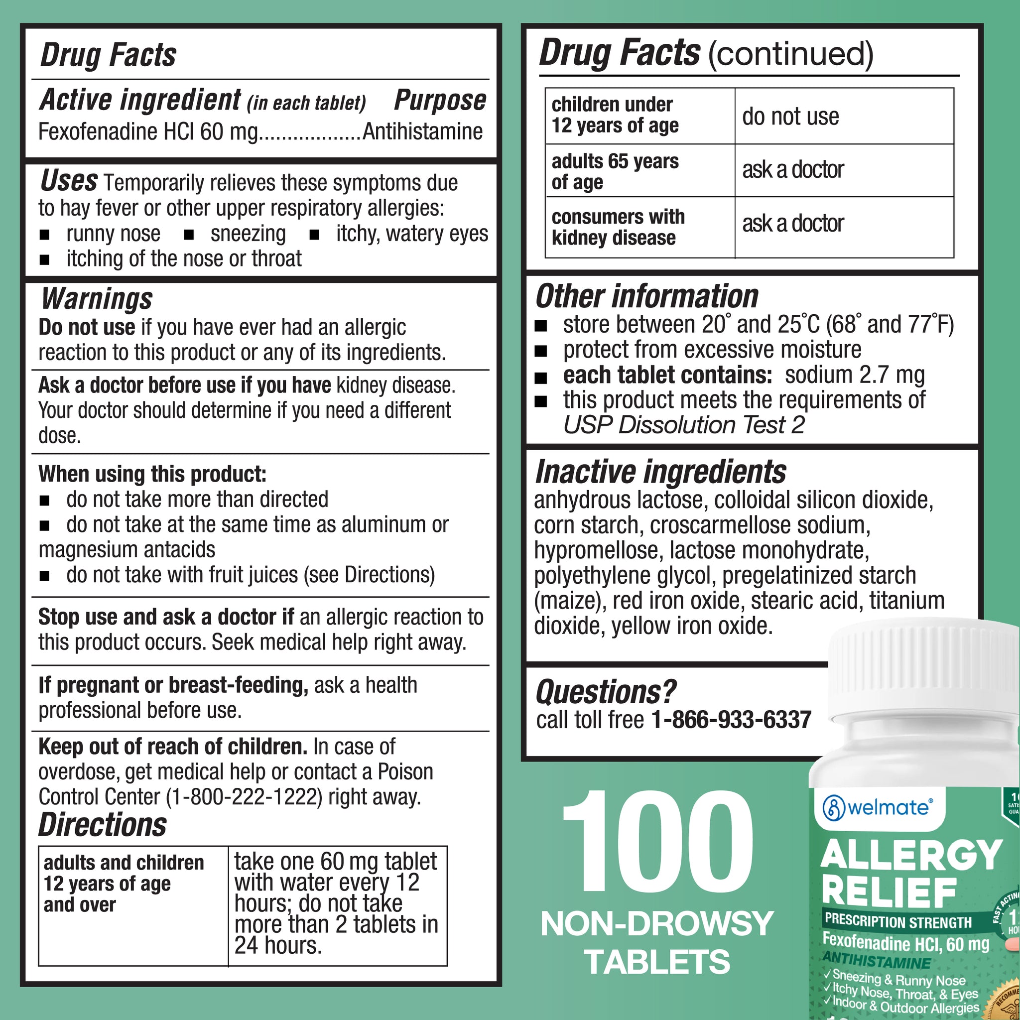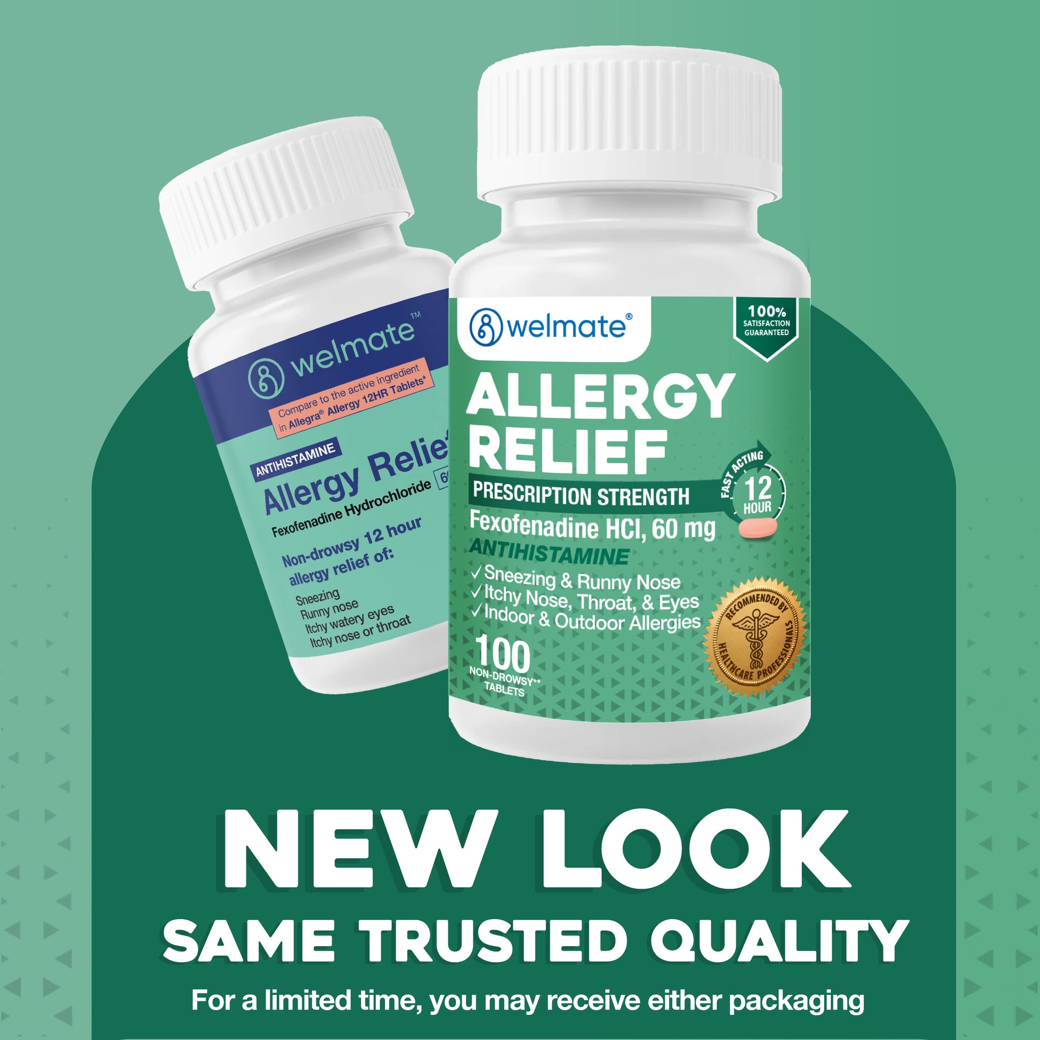 Formulated with active ingredient fexofenadine, Welmate Allergy Relief's prescription-strength antihistamine contains 60mg of Fexofenadine HCl that provides 12-hour support for watery eyes, sneezing, runny nose, itchy throat and other symptoms of indoor and outdoor allergies. Compare to the active ingredient in Allegra Allergy 12 HR.