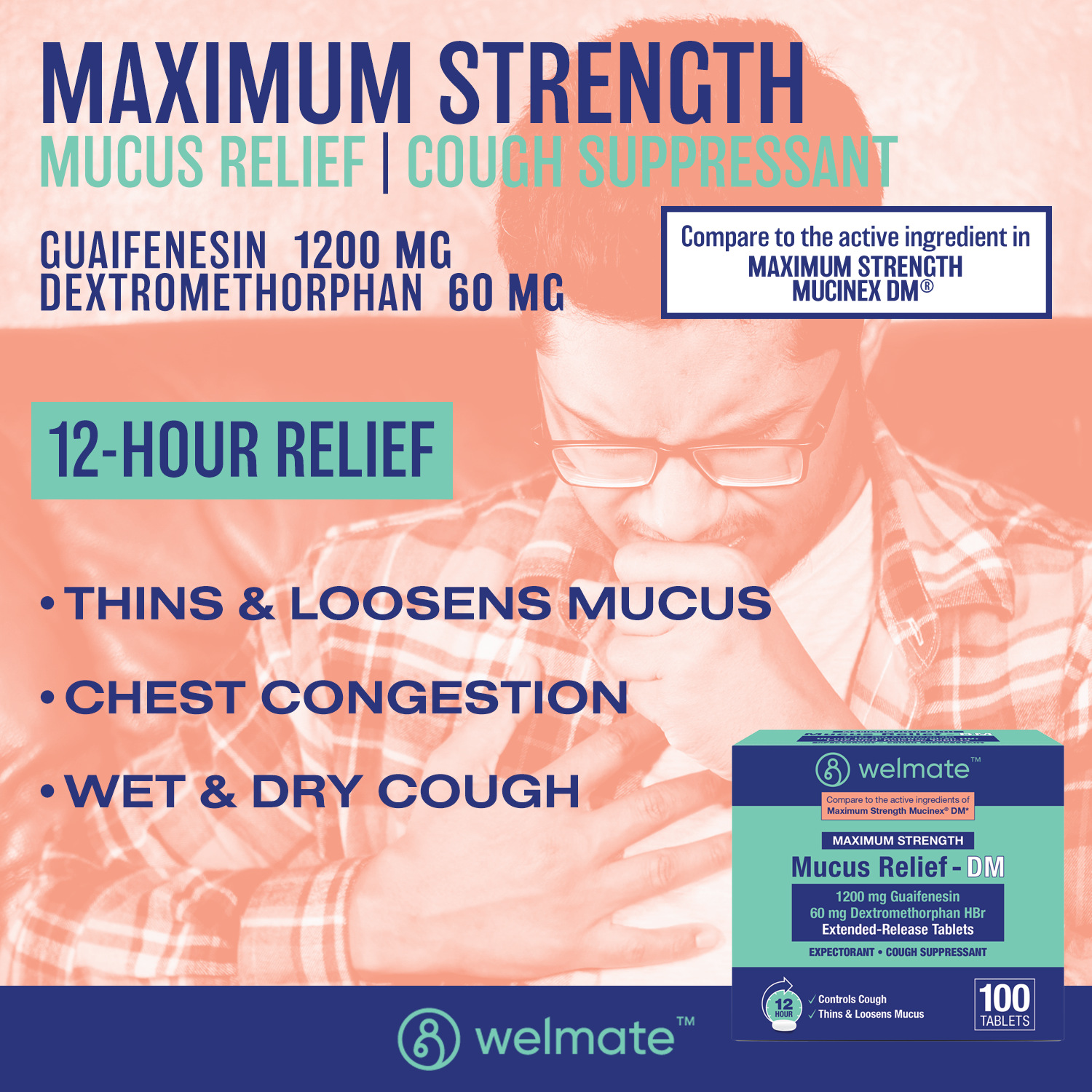 Looking for help loosening mucus and clearing out your chest for more productive coughing? With Welmate's Mucus Relief DM, you can have up to 12 hour relief from symptoms associated with mucus build up and coughing. Use one tablet every 12 hours for best results. Generic of Maximum Strength Mucinex DM.